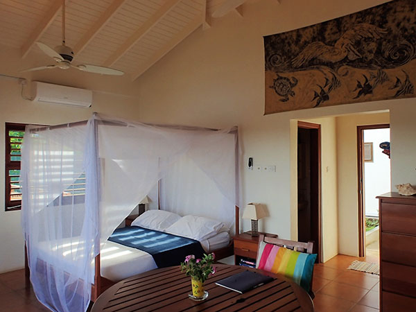 The Apartment and Studios include - Private verandas with panoramic sea and beach views - Ceiling fans and side fans in bedrooms - Air-conditioning in bedrooms ($5 per day) - Four poster beds with mosquito nets - Hairdryers - All bathrooms have showers - Daily cleaning (towel & linen change every 3 days) - Beach towels - Safe - Fully equipped kitchens with microwave, large fridge/freezer, oven, toaster kettle and coffee maker - Welcome pack of tea and coffee |